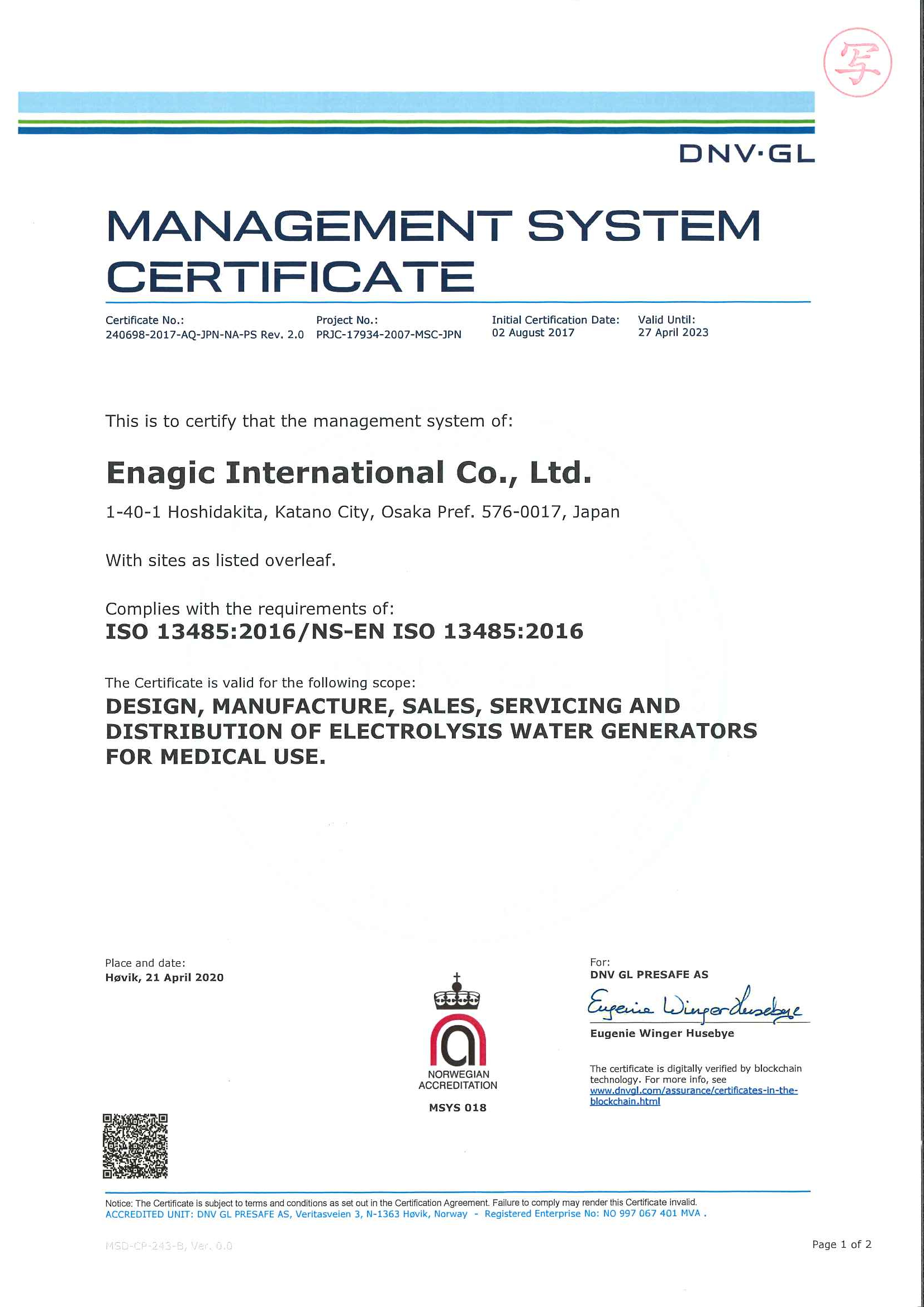 Enagic International is certified to; ISO 9001, ISO 14001, and ISO 13485 for quality control and environmental management, the Water Quality Association Gold Seal for product certification, and a member in good standing of the prestigious Direct Selling Association.